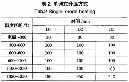 綜合以上各方面因素,本工作有針對(duì)性地對(duì)比了兩種熱處理制度的影響。一種為單調(diào)式升溫法,與傳統(tǒng)升溫方法相同,具體升溫方式如表5所示,在600℃保溫100min,充分燃盡燒失物。上限溫度為1350℃,分別保溫3h、6h和12h,以D1、D2、D3分別標(biāo)記。第二種為非單調(diào)式升溫法,與傳統(tǒng)升溫方法不同,采用的是先升后降再保溫的過(guò)程。此種非單調(diào)升溫法在理論上的考慮在于溫度是莫來(lái)石化的主要推動(dòng)力,通過(guò)提高上限燒成溫度使得莫來(lái)石轉(zhuǎn)化率有所提高。而同時(shí)需要考慮到高溫有利于莫來(lái)石晶體發(fā)育長(zhǎng)大,因?yàn)榫w長(zhǎng)大意味著部分微孔結(jié)構(gòu)的喪失以及材料脆性增加。故在達(dá)到設(shè)定的上限溫度并保溫少段時(shí)間后,再把溫度降下來(lái),主要保溫時(shí)間在次低溫度下進(jìn)行并完成。本工作設(shè)定的非單調(diào)升溫方式如表6所示。在600℃保溫100min,充分燃盡燒失物。然后分別升至1400℃、1450℃的高溫,保溫10min或60min,緊接著將溫度降至1300℃,分別繼續(xù)保溫不同時(shí)間,依次標(biāo)記為F1~F5。
