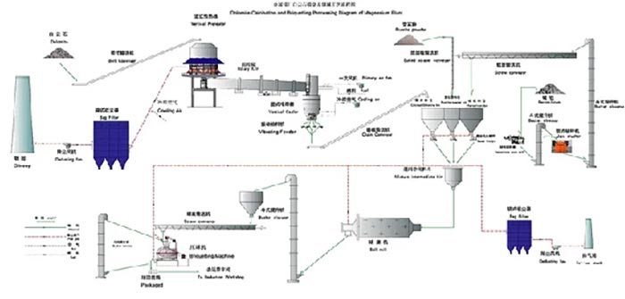 金屬鎂生產工藝流程-回轉窯煅燒白云石工藝流程:抓斗起重機將白云石送至皮帶輸送機,經振動篩選出塊度合格的金屬鎂,由大傾角皮帶送到預熱器頂部料倉。料倉內的白云石分別通過六個溜管進入預熱器,煅燒過程生產的約900℃熱煙氣與白云石再此換熱。白云石被預熱到800℃時由液壓推桿將石料推入回轉窯尾部煅燒。金屬鎂回轉窯的旋轉使石白云石均勻受熱,同時向窯頭方向逐步運動。窯頭罩處安裝有燒嘴,燃燒溫度達1250℃,以滿足活性煅白對溫度的需求。熾熱的煅白從窯頭落入冷卻器,與鼓風機鼓入的二次空氣換熱。空氣被預熱至約600℃進入窯頭助燃,煅白被冷卻到100℃以下,通過振動給料機均勻落至鱗板輸送機輸送至下道工序。離開預熱器約260℃的尾氣,通過管道進入袋式除塵器,對尾氣進行凈化,實現達標排放,完成整個煅燒金屬鎂工藝流程。