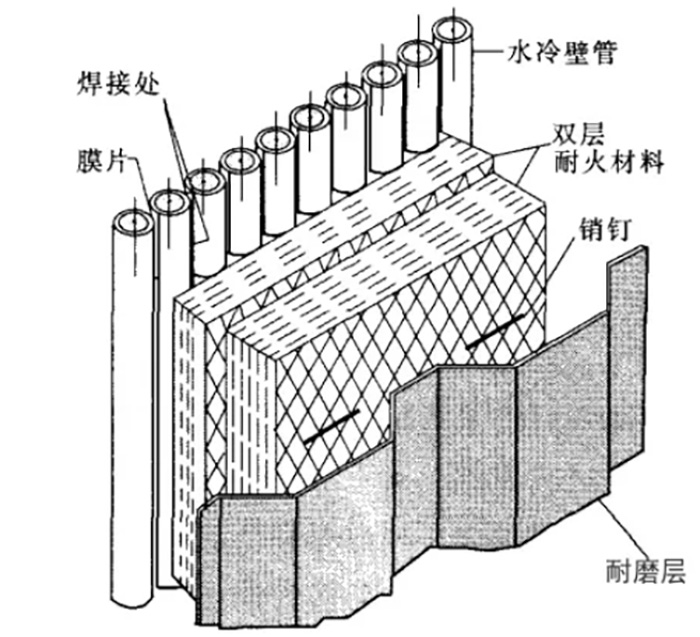 需要敷設耐磨澆注料區域還有翼墻管式水冷壁下部,尤其是在管子穿墻處,因為該區域的磨損相當嚴重。如圖2所示,對爐內耐火材料較厚的特殊區域,需要將耐火材料分層澆注。