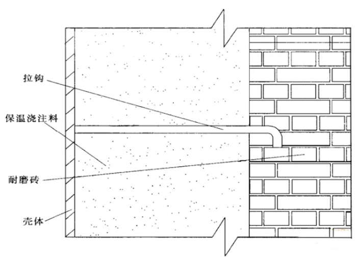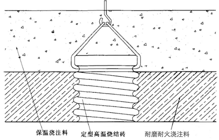 (3)采用固定抓釘和高溫燒結磚的澆注料結構形式
