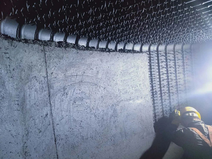 考慮到以上磨損的特點、耐磨材料的物理性能及施工特點,一般采用單層或多層耐磨耐火材料的敷設。單層敷設的部位包括水冷壁、屏式受熱面、水冷隔墻、雙面水冷壁、汽冷分離器等薄襯里處,用φ6或 φ10 的圓柱銷釘( 或 Y 型 V 型銷釘) 將耐磨耐火澆注料支撐在管壁煙氣側。薄襯里更能經得起鍋爐起停時的快速熱沖擊,同時, 為增強其剛性及沖擊能力,需在澆注料中增加不銹鋼纖維。厚襯里分為兩層或三層,煙氣側為耐磨耐高溫的耐磨