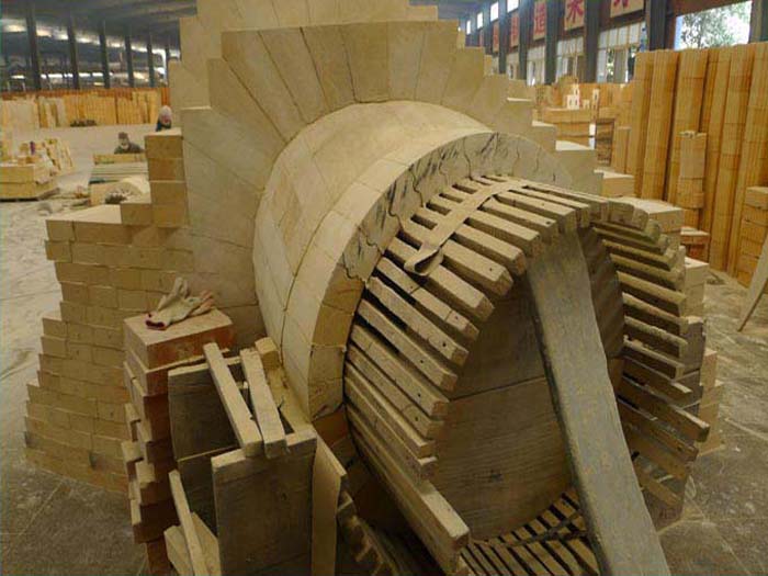 爐腰:起著緩沖上升煤氣流的作用。爐料在這里已部分還原造渣,透氣性較差,故爐腰直徑有逐漸擴大之勢。爐腰髙度則不易過高,大高爐一般為2m左右,如某1000m3高爐,其爐腰高度僅616mm。另外,因為爐腰部位的物料沖刷嚴重,所以爐腰是髙爐的一個薄弱環節。榮盛耐材技術人員會為您提供合理施工方案。